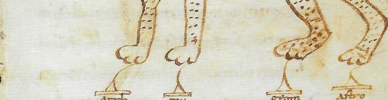 st gall pantherFor long and weary I have kept a postcard on my wall which I acquired on a visit to St Gall several years ago. It comes from a ninth century manuscript of a well-known sixth century educational work by Cassiodorus called ‘The Institutiones’, which set out the plan he had for the education of the monks at the monastery he founded at Vivarium and it is only one of several diagrams in the work.[1] I love it and I have always called it ‘the panther’ although the official description is ‘a panther-like animal’. His function is to show the four divisions of the subject of Mathematics in the traditional ‘Seven Liberal Arts’, a kind of medieval syllabus for monks. It is part of the Quadrivium, the higher level of learning to be undertaken once the basics of Grammar had been mastered. The four divisions are here represented by the four feet of the panther, each labelled appropriately.